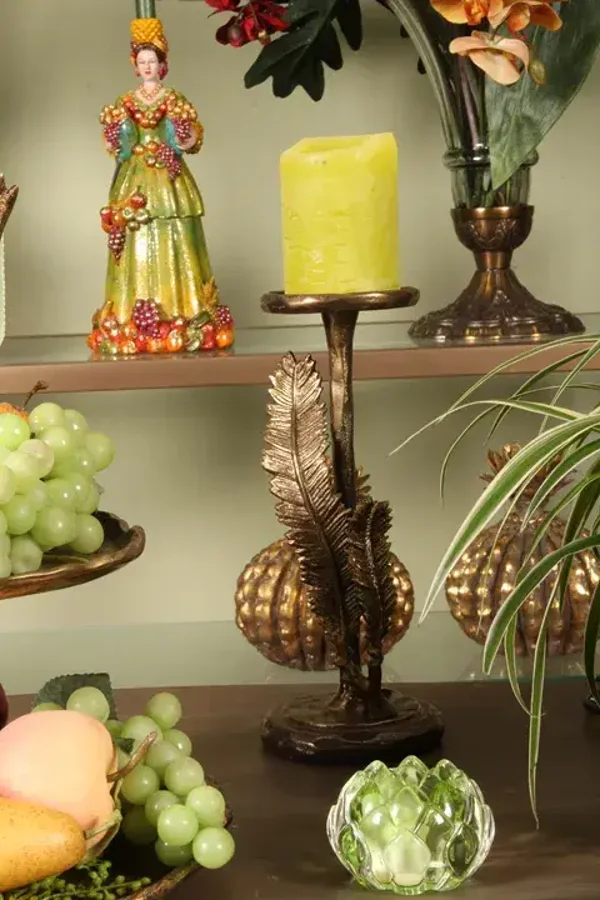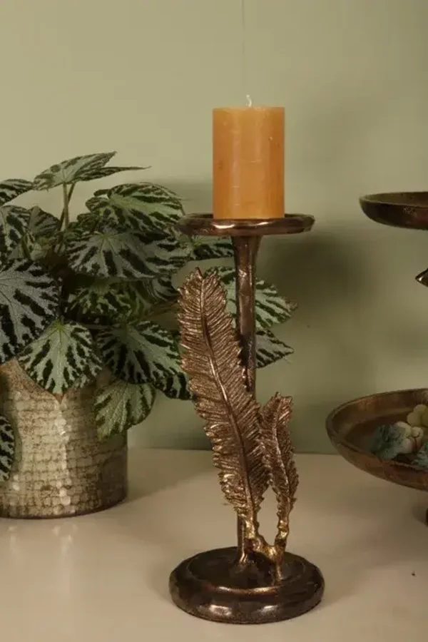 Deze kandelaar met twee sierlijke veren is een opvallend decoratief object, uitgevoerd in een luxe gouden en koperkleurige afwerking. De gedetailleerde veren geven de kandelaar een elegante en verfijnde uitstraling. Het ontwerp biedt plaats voor één grote kaars.