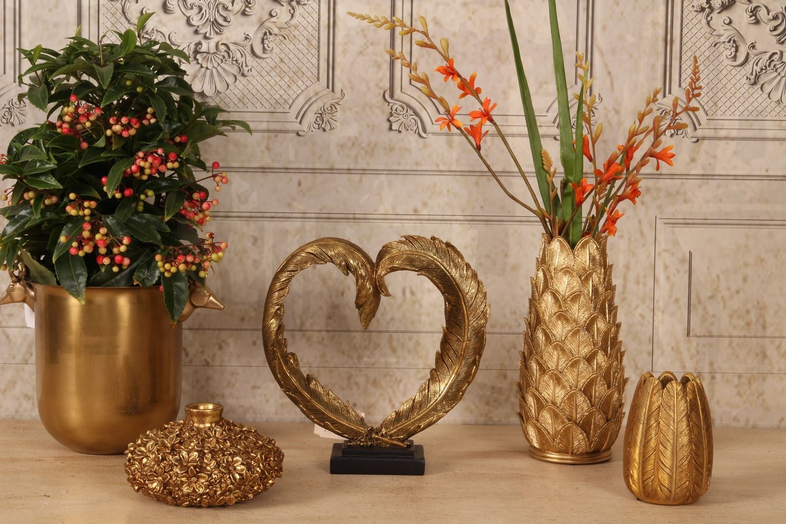 Decoratief beeld van veren in hartvorm, uitgevoerd in goudkleurig resin (22 cm). Symbool voor liefde en elegantie.